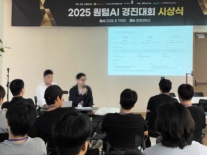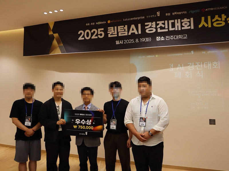 제 1회 퀀텀AI 경진 대회 '우수상' 수상 안녕하세요. 지난 제 1회 퀀텀AI 경진 대회에서[IBM x Redhat]AI transformation AX Academy 3기 훈련생(장ㅇ진, 이ㅇ용, 이ㅇ우, 강ㅇ우)이'우수상'을 수상하였습니다! 수상자 여러분에게 축하의 박수를 보내주세요~~ 감사합니다.